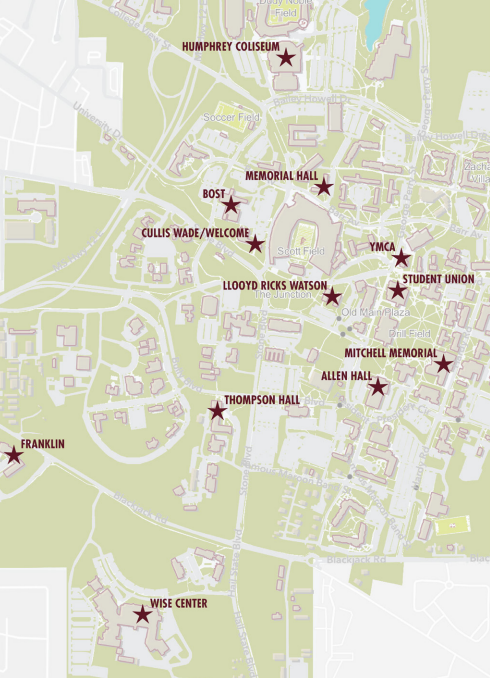 The Colvard Student Union, Memorial Hall, and the Cullis Wade Depot/Welcome Center will be available during most game day events on campus.