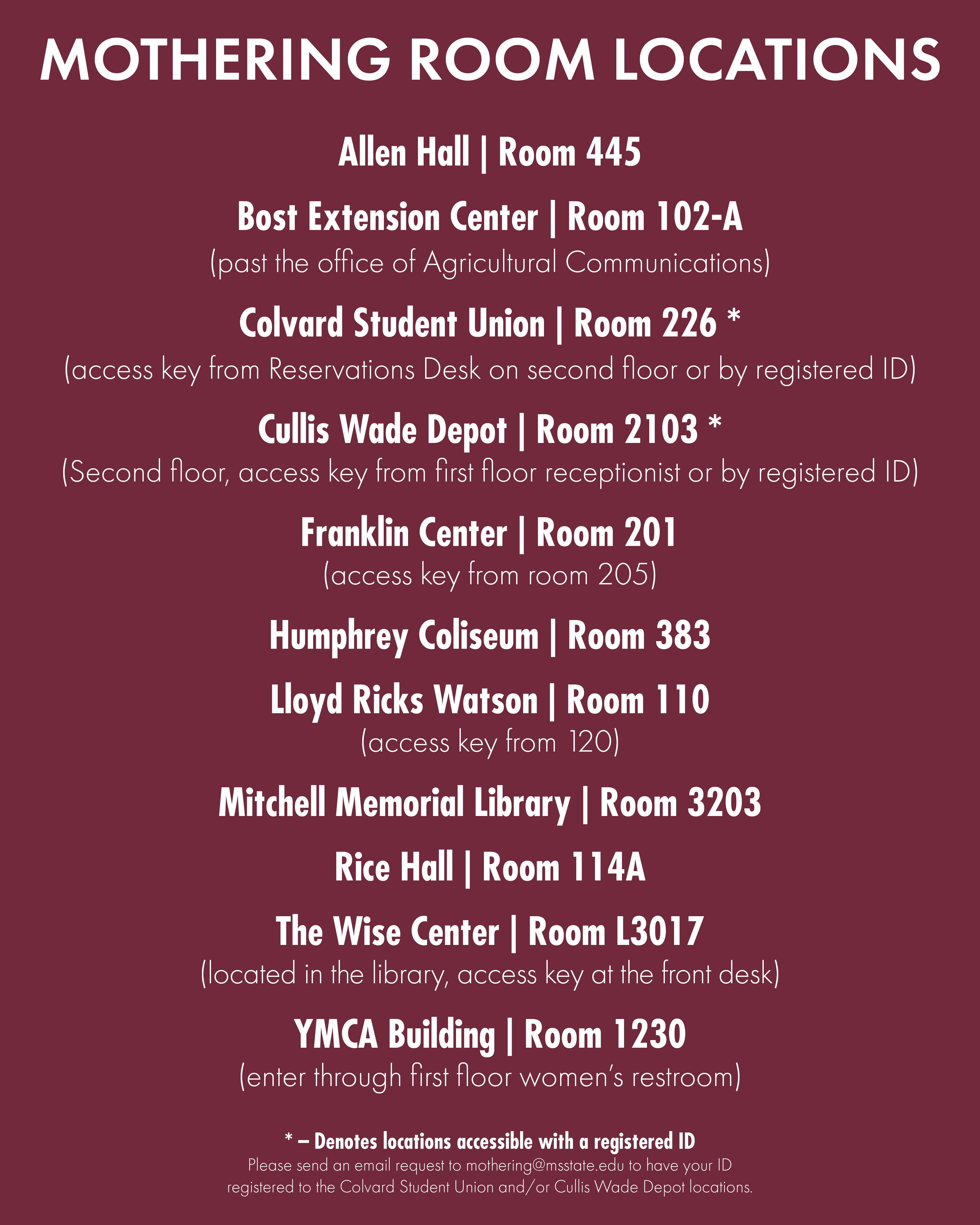 To have your ID registered to the Colvard Student Union and/or Cullis Wade Depot/Welcome Center locations, please send an email to mothering@msstate.edu.